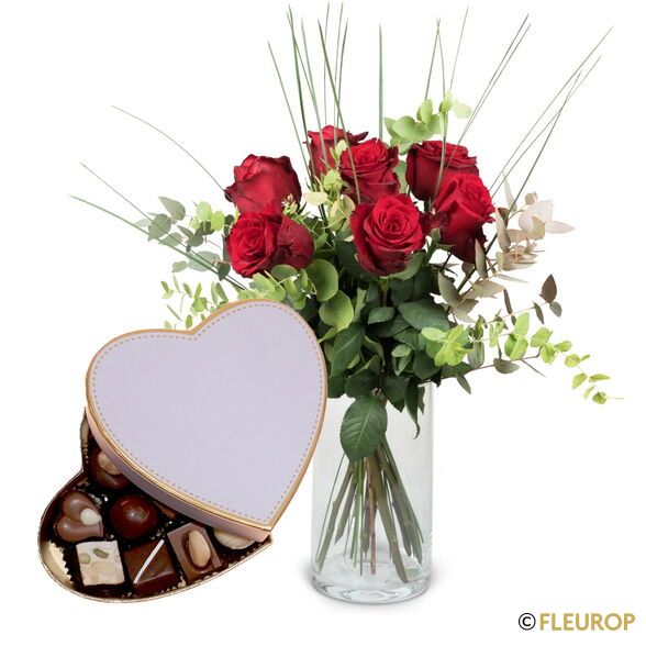 Red roses with heart filled with chocolates